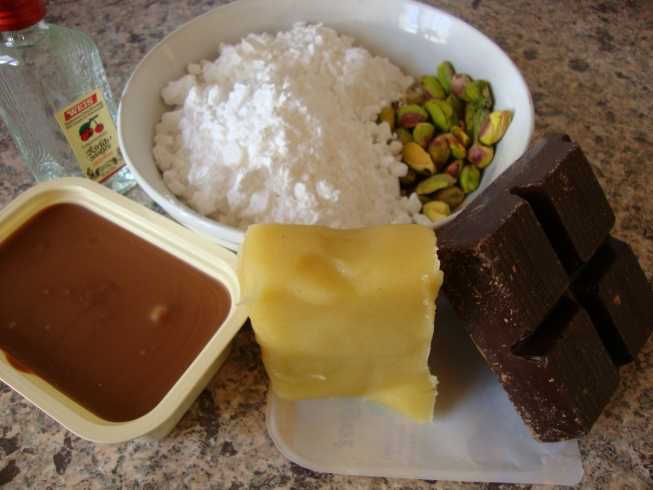probiert. Den ersten Versuch machte ich mit Marzipan-Pistazien-Pralinen. Diese haben einen leckeren Nougatkern, sind mit Pistazien-Marzipan umgeben und mit Kuvertüre überzogen.